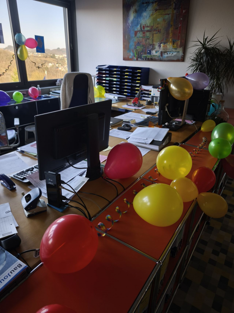 Wer heute einen Blick in ihr Büro wirft, sieht: Wir lassen sie natürlich nicht ohne eine Überraschung und ein buntes Farbenmeer aus Luftballons gehen.